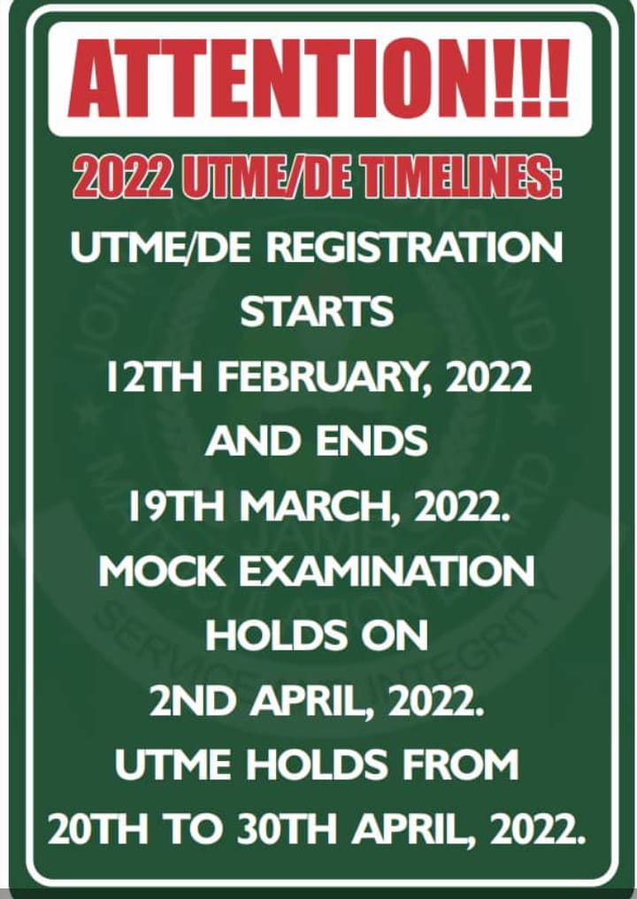 JAMB ANNOUCES REGISTRATION , MOCK & UTME DATE FOR 2022/2023 24Jan 20225 Feb 2022Add a comment JAMB ANNOUCES REGISTRATION COMMENCEMENT DATE FOR 2022/2023👇👇👇 Share this: Share on Facebook (Opens in new window) Facebook More Share on X (Opens in new window) X Like Loading... Related