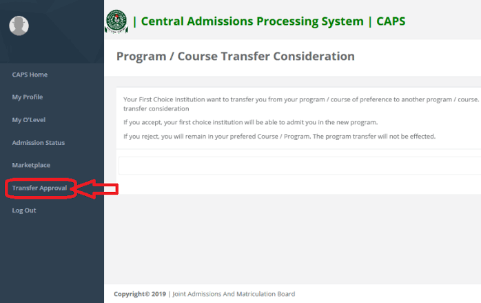 The JAMB CAPS Transfer Approval Page is one of the new features of the JAMB CAPS. On the Transfer approval page, candidates are notified of the intention of their school of choice to transfer them from the course they initially applied to study to another course. The candidates now have the right to either accept or reject the transfer.